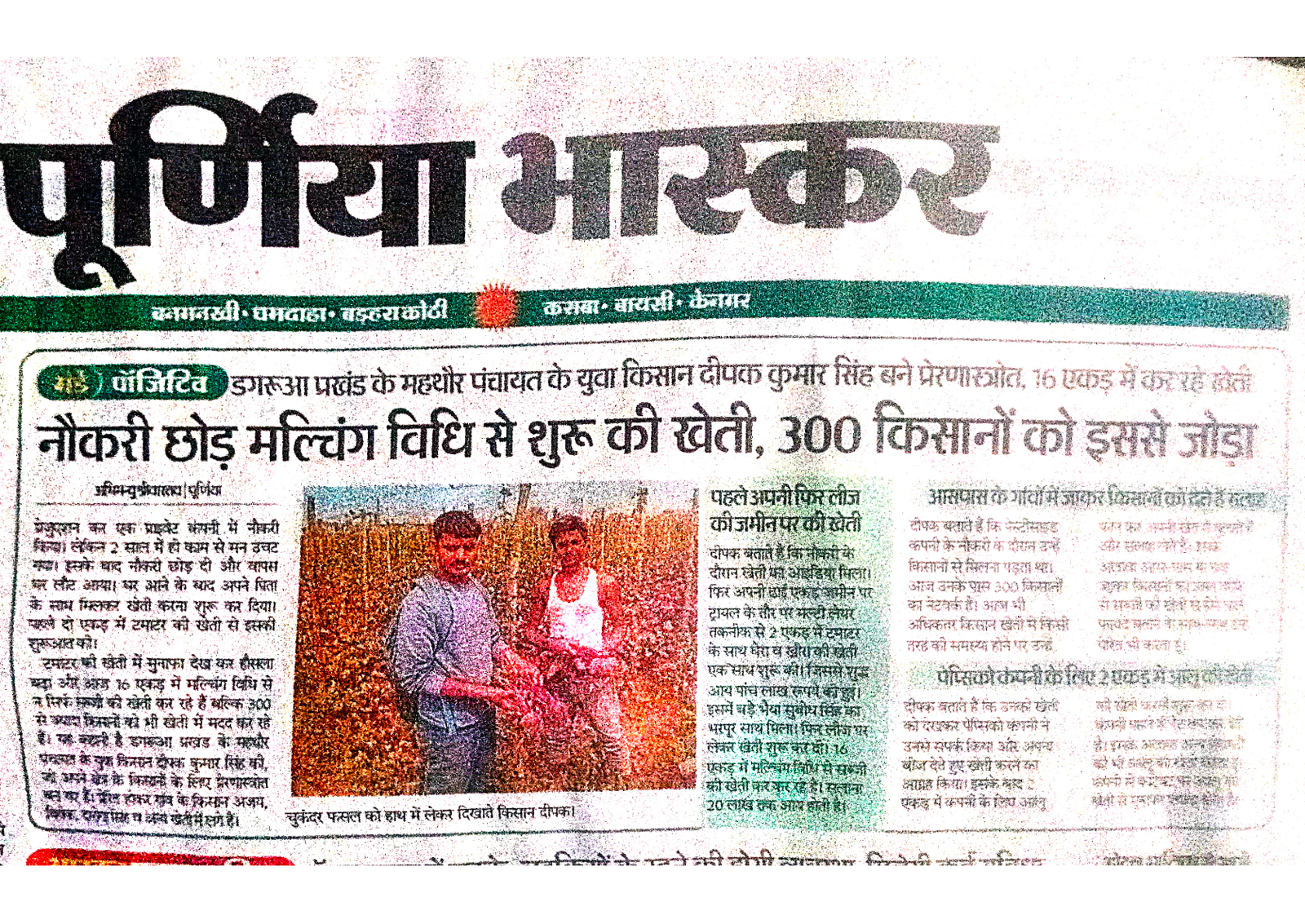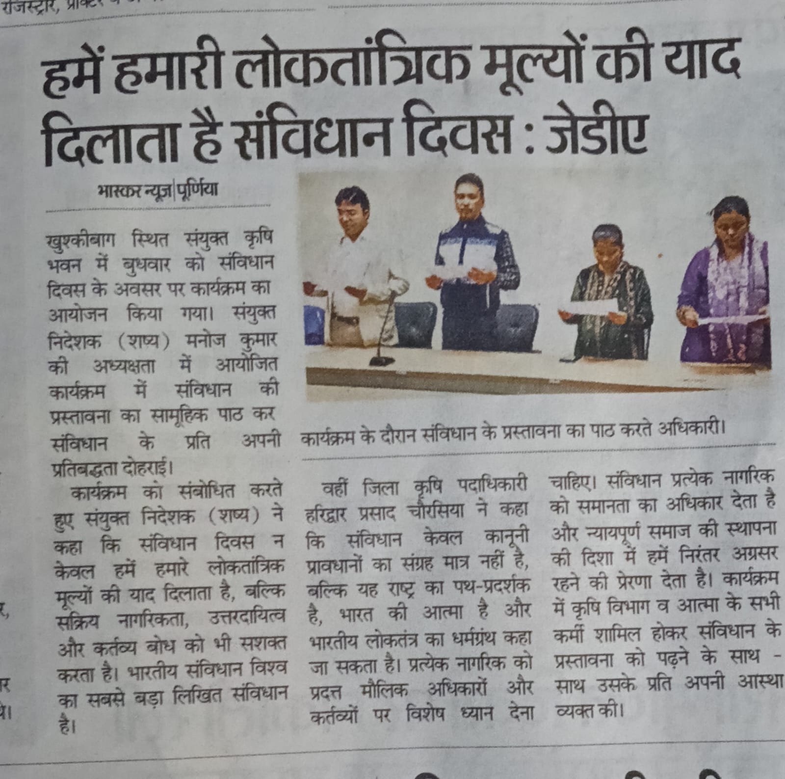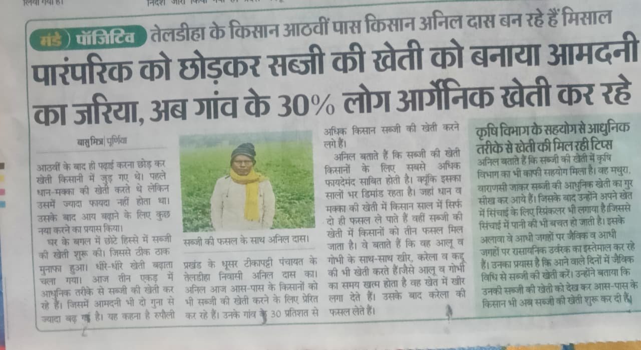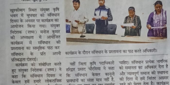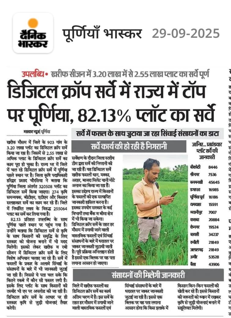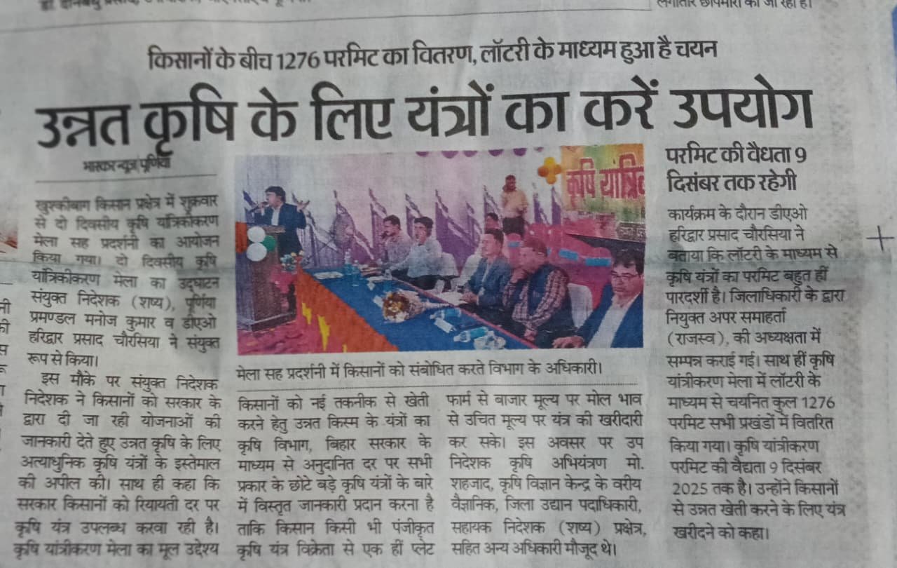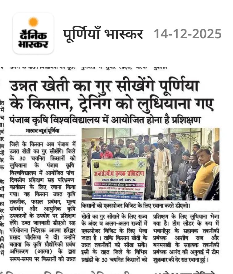 पूर्णिया जिला के सभी 14 प्रखंडों से कुल 35 प्रगतिशील कृषकों को दिनांक 2 से 6 सितंबर 2024 तक आत्मा योजना के अंतर्गत राज्य के बाहर प्रशिक्षण हेतु भेजा गया उक्त प्रशिक्षण में राष्ट्रीय डेयरी अनुसंधान संस्थान करनाल भेजा गया सभी 35 किसानों के साथ टीम लीडर के रूप में श्री प्रणव कुमार एवं श्री आदित्य कुमार है इस ट्रेनिंग में भाग लेने वाले सभी कृषकों के साथ जिला कृषि पदाधिकारी सह परियोजना निदेशक आत्मा के द्वारा अच्छे यात्रा की शुभकामना दी